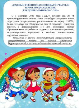 С 01.09 2026 в ГБДОУ № 74 Красногвардейского района открывается структурное подразделение компенсирующей направленности, по адресу: Санкт-Петербург, пр-т Энтузиастов, д. 48, стр.1